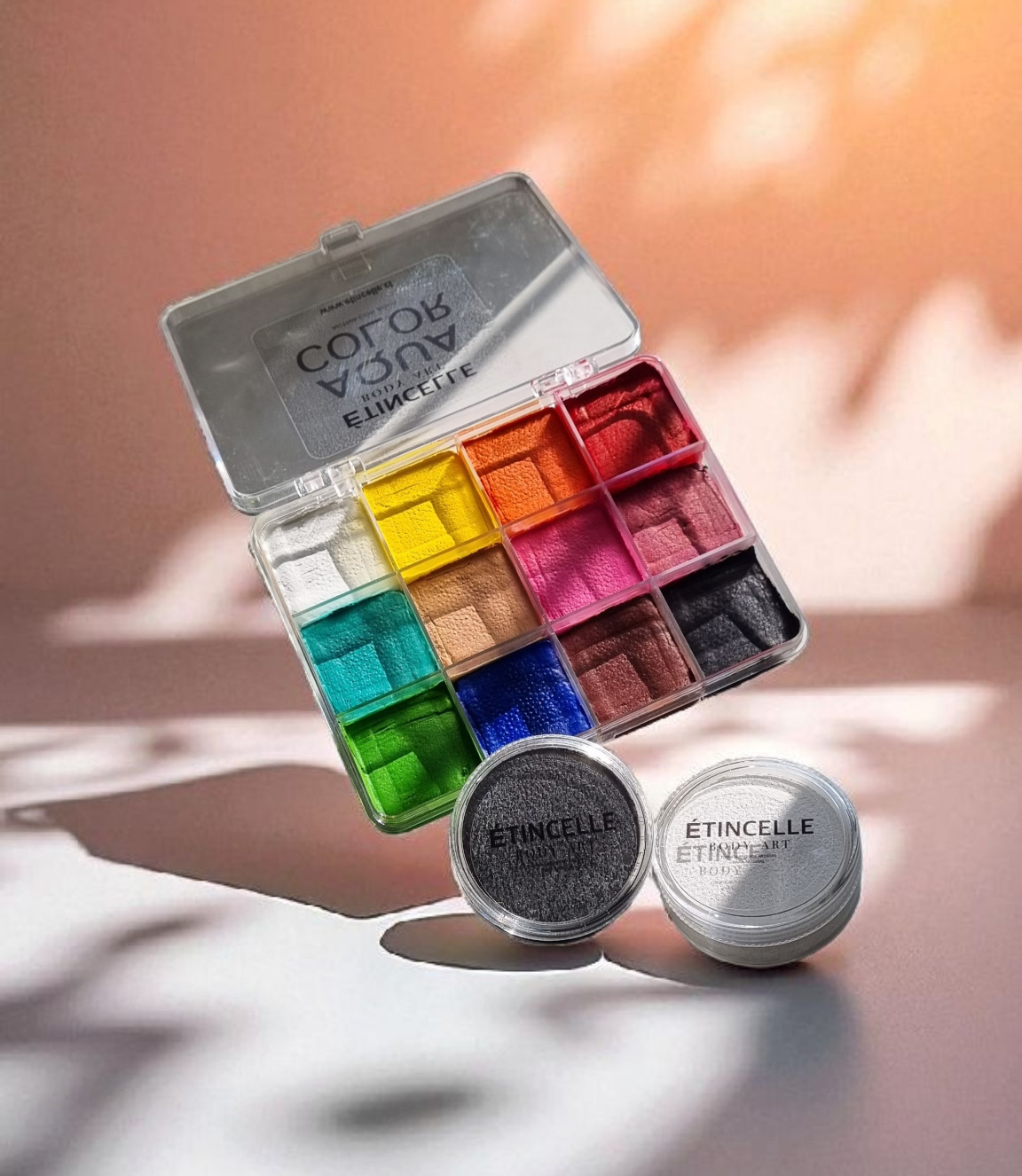 (A) PALETA XL 12 COLORES BÁSICA: Blanco, nude, agua, verde, azul, tabaco. amarillo, naranjo, rojo, rosado, violeta, negro.